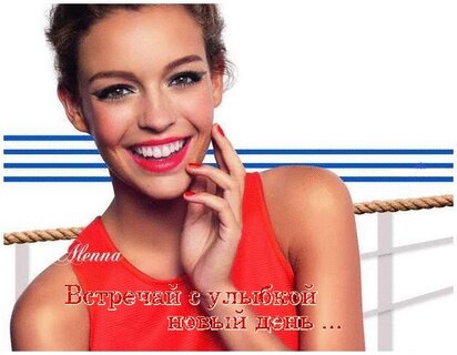 Красивая и жизнерадостная молодая женщина с очаровательной улыбкой в красной майке. На изображении присутствует вдохновляющая надпись на русском языке: "Встречай с улыбкой новый день...". Картинка передает позитивную энергию, бодрость и оптимизм, идеально подходя для утренних пожеланий, открыток в соцсетях и статусов, мотивирующих начать день с хорошего настроения.
