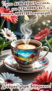 Теги:вторник, дни недели, доброе утро, цветы, герберы, кофе, тепло, солнечно, красивая картинка, приятных сюрпризов, мягкого и доброго дня