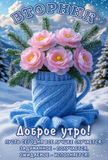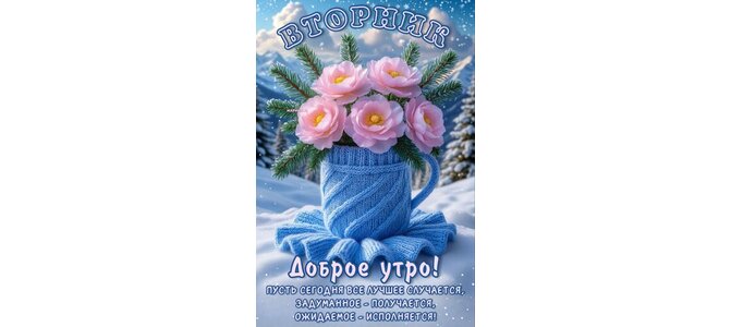 Открытка "ВТОРНИК. ДОБРОЕ УТРО! ПУСТЬ СЕГОДНЯ ВСЕ ЛУЧШЕЕ СЛУЧАЕТСЯ, ЗАДУМАННОЕ - ПОЛУЧАЕТСЯ, ОЖИДАЕМОЕ - ИСПОЛ"