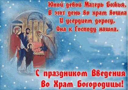 Юной девой Матерь Божья в этот день во храм вошла. И усердием дорогу, она к Господу нашла. С праздником Введения Во Храм Богородицы!