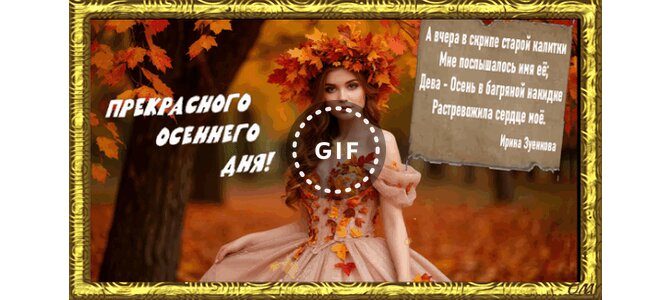 Прекрасного осеннего дня! Текст на открытке отрывок из стихотворения Дева-Осень автор Ирина Зуенкова " А вчера в скрипе старой калитки мне послышалось имя ее; Дева-Осень в багряной накидке растревожила сердце мое"