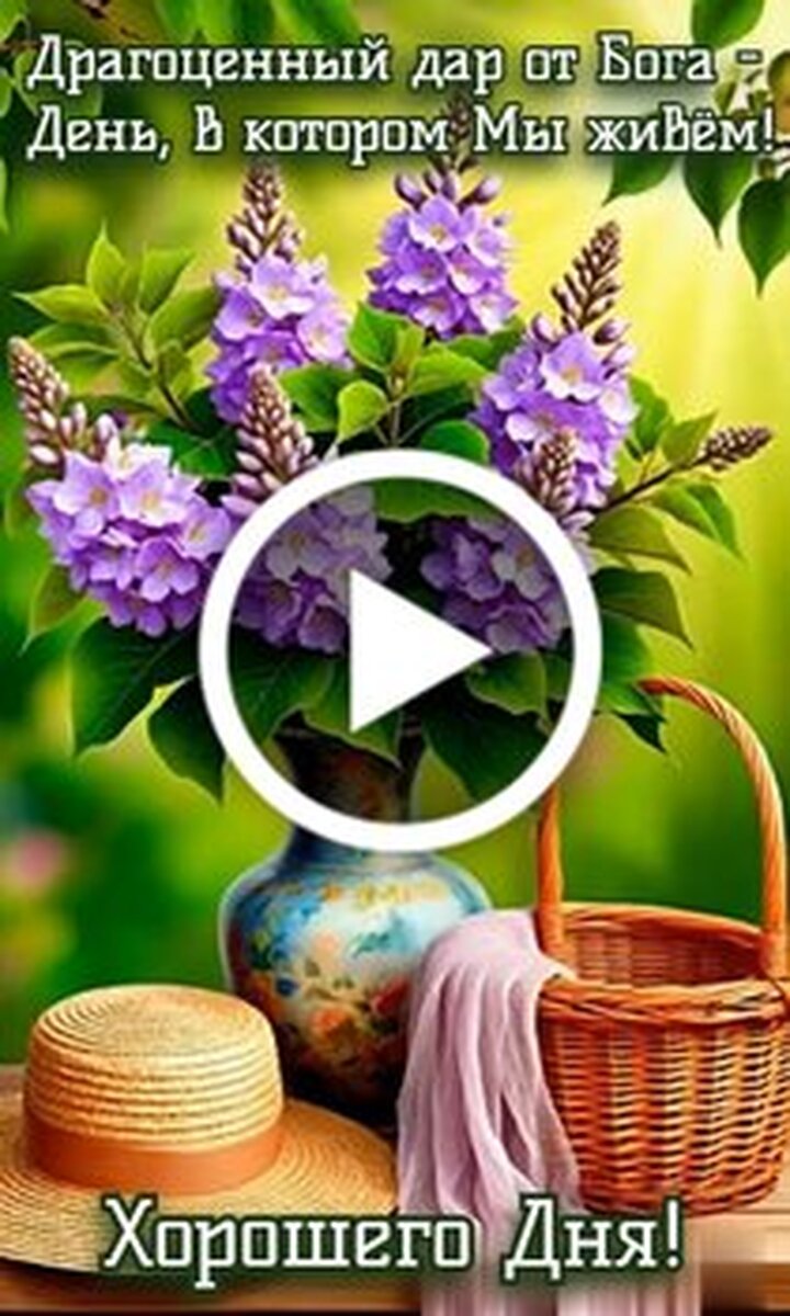 Красивое и вдохновляющее видео с пожеланием доброго дня. В центре композиции находится изящная ваза с пышным букетом фиолетовых цветов на фоне солнечного сада. Рядом стоит плетеная корзинка, в которой уютно устроился милый рыжий котенок. Рядом лежит соломенная шляпа, создающая атмосферу теплого летнего дня. Текст на видео напоминает о том, что каждый прожитый день является драгоценным даром Бога. Это идеальное видео для того, чтобы поделиться позитивом, теплом и светлыми мыслями с близкими людьми и пожелать им прекрасного настроения.