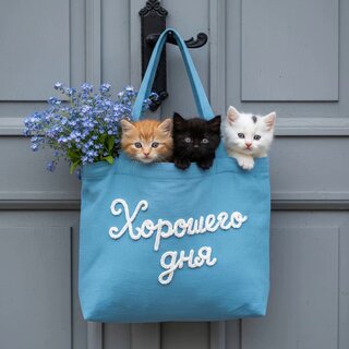 Милое и эстетичное изображение трех маленьких котят (рыжего, черного и бело-черного), которые выглядывают из синей тканевой сумки-шоппера. Сумка висит на серой двери, рядом с ней расположен букет нежно-голубых цветов (незабудок). На сумке белой вышивкой нанесена надпись на русском языке «Хорошего дня». Фотография выполнена в светлых, пастельных тонах, создает ощущение уюта, радости и вдохновения. Идеально подходит для тематики милых животных, эстетики повседневности и позитивных пожеланий.
