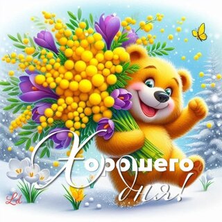 Милая и яркая поздравительная открытка с изображением пушистого золотистого медвежонка, который обнимает огромный букет из желтых мимоз и фиолетовых крокусов. На фоне — зимний пейзаж с заснеженными елями и летящими снежинками, что создает атмосферу ранней весны. В центре композиции красивая белая надпись на русском языке «Хорошего дня!». Иллюстрация выполнена в мультяшном стиле, она наполнена теплом, радостью и весенним настроением, идеально подходит для отправки друзьям и близким в мессенджерах или социальных сетях.