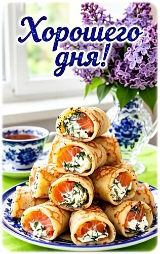 Аппетитная подборка праздничных открыток с изображением вкусных блинчиков с красной рыбой и творожным сыром, украшенных зеленью. На заднем плане — нежный букет сирени в вазе у окна, создающий весеннее и уютное настроение. Идеально подходит для пожелания хорошего дня друзьям и близким в мессенджерах и социальных сетях.
