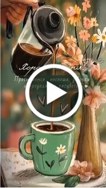 Уютное эстетичное видео с теплыми пожеланиями доброго утра. На видео показан процесс наливания ароматного кофе в красивую зеленую кружку с цветочным принтом. Рядом стоит ваза с нежными цветами, создающая атмосферу весеннего пробуждения и спокойствия. На экране появляется вдохновляющая надпись Хорошего дня и мотивирующая фраза Просыпаемся не спеша девчонки и продолжаем расцветать. Это идеальное видео для создания настроения, ежедневных сторис или просто для того, чтобы пожелать близким прекрасного начала дня.