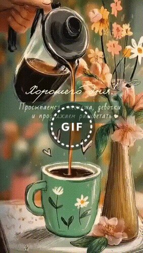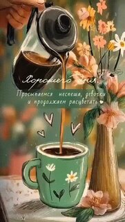 Уютная художественная иллюстрация с изображением процесса наливания свежего кофе из кофейника в красивую зеленую кружку с цветочными узорами. На фоне — нежный букет весенних цветов в вазе, создающий теплую и вдохновляющую атмосферу. На картинке присутствует надпись на русском языке: "Хорошего дня! Просыпаемся неспеша, девочки, и продолжаем расцветать". Изображение идеально подходит для пожеланий доброго утра, эстетичных сторис и создания настроения уюта и женственности.