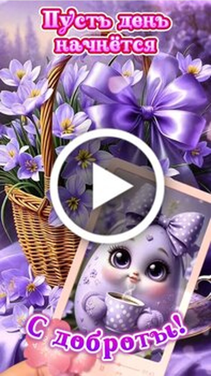 Красивое и вдохновляющее видео в фиолетовых тонах для пожелания доброго утра. Сюжет начинается с нежной композиции из корзины с фиолетовыми цветами, украшенной пышным бантом, и чашки ароматного кофе. Затем внимание переключается на милого сказочного персонажа в виде фиолетового существа с большими глазами, которое держит чашку кофе. Видео наполнено теплыми пожеланиями улыбок, счастья, любви и позитива. Завершается ролик прекрасной мыслью о том, что жизнь чудесна и красива. Идеально подходит для отправки близким и друзьям в качестве доброго утреннего приветствия.