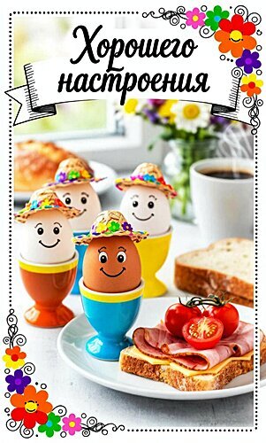 Аппетитный и позитивный завтрак с забавными яйцами в подставках, украшенными миниатюрными шляпками. На тарелке — тосты с ветчиной, сыром и свежими черри. Уютная атмосфера утра, чашка кофе и яркая цветочная рамка с надписью «Хорошего настроения». Идеальное изображение для создания позитивного настроя, пожелания доброго утра и вдохновения на новый день.