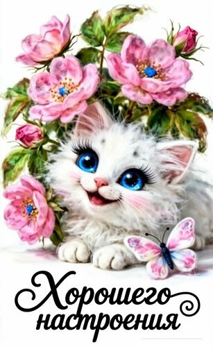 Милая и очаровательная иллюстрация с пушистым белым котенком, у которого большие голубые глаза и длинные ресницы. Котенок окружен пышными розовыми цветами и нежно-розовыми бутонами. Рядом с лапкой сидит изящная розовая бабочка. В нижней части изображения расположена красивая каллиграфическая надпись на русском языке «Хорошего настроения». Картинка выполнена в светлых, нежных тонах, создавая атмосферу радости, уюта и тепла. Идеально подходит для открыток, пожеланий и поднятия настроения.