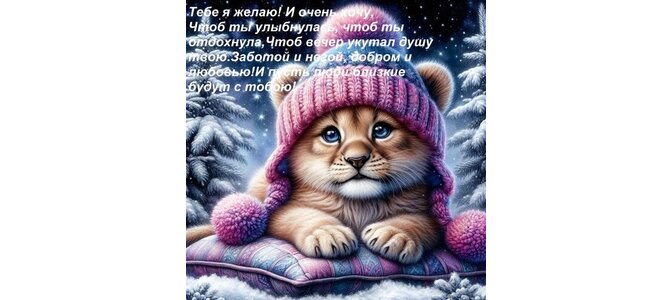 Теги:хорошего вечера, очень беспечного тебе я желаю и очень хочу, чтоб ты улыбнулась, чтоб ты отдохнула, чтоб вечер укутал душу твою заботой и негой, добром и любовью и пусть люди близкие будут с тобою