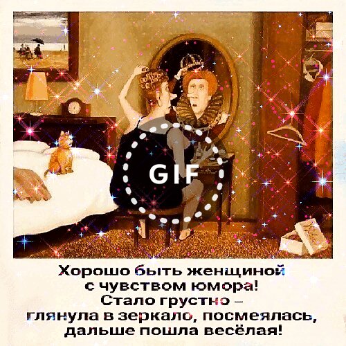 Анимированная открытка "Хорошо быть женщиной с чувством юмора! Стало грустно - глянула в зеркало, посмеялась, дальше пошла в"