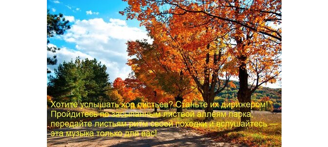 Теги:хотите услышать хор листьев станьте их дирижером пройдитесь по засыпанным листвой аллеям парка, передайте листьям ритм своей походки и вслушайтесь эта музыка только для вас