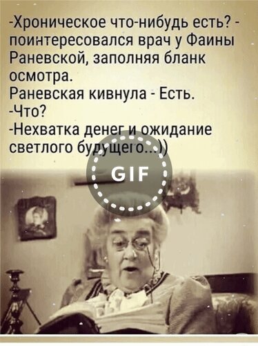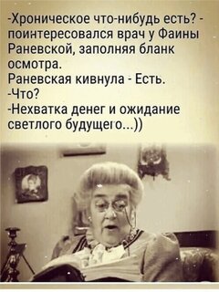 - Хроническое что-нибудь есть? - поинтересовался врач у Фаины Раневской, заполняя бланк осмотра. Раневская кивнула - Есть. - Что? - Нехватка денег и ожидание светлого будущего...))