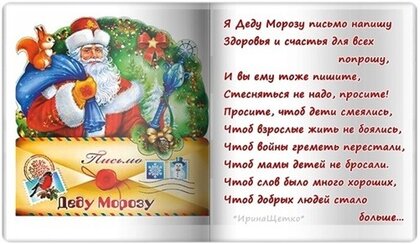 Письмо Деду Морозу. Я Деду Морозу письмо напишу здоровья и счастья для всех попрошу. И вы ему тоже пишите, стесняться не надо, просите! Просите, чтоб дети смеялись, чтоб взрослые жить не боялись, чтоб войны греметь перестали, чтоб мамы детей не бросали. Чтоб слов было много хороших, чтоб добрых людей стало больше...