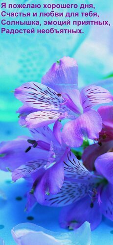 Красивое вертикальное изображение с нежными фиолетовыми цветами (альстромериями) на светло-голубом фоне. На картинке размещен поздравительный текст на русском языке: «Я пожелаю хорошего дня, счастья и любви для тебя, солнышка, эмоций приятных, радостей необъятных». Изображение идеально подходит для отправки в мессенджерах (WhatsApp, Viber, Telegram) в качестве доброго пожелания, открытки «Хорошего дня» или «С добрым утром» для друзей, близких и любимых. Нежные оттенки синего и пурпурного создают спокойное и радостное настроение.