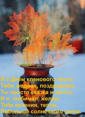 Теги:я с днём кленового листа тебя, родная, поздравляю, ты просто сказка и мечта, и я, любимая, желаю тебе везения, тепла, побольше солнечного света