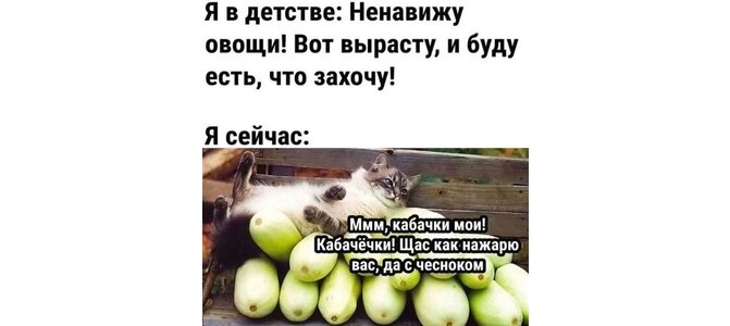 Я в детстве: Ненавижу овощи! Вот вырасту, и буду есть, что захочу! Я сейчас: Ммм, кабачки мои! Кабачёчки! Щас как нажарю вас, да с чесноком