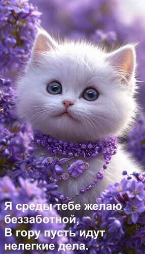 Милая и нежная открытка с пушистым белым котенком голубых глаз на фоне цветущей фиолетовой сирени. Котенок украшен изящным жемчужным ожерельем. На изображении размещен душевный стих на русском языке с пожеланием беззаботной среды. Идеально подходит для отправки в мессенджерах (WhatsApp, Viber) или социальных сетях в качестве поздравления и добрых пожеланий на среду. Картинка наполнена весенним настроением, уютом и эстетикой.