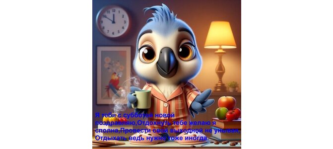 Теги:я тебя с субботой новой поздравляю, отдохнуть тебе желаю я сполна, провести свой выходной не унывая, отдыхать ведь нужно тоже иногда