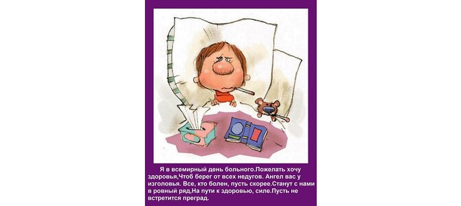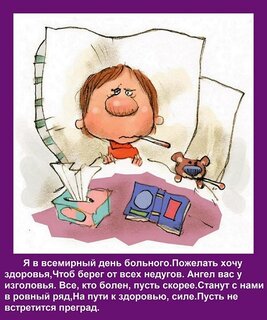 Теги:я в всемирный день больного пожелать хочу здоровья, чтоб берег от всех недугов ангел вас у изголовья все, кто болен, пусть скорее станут с нами в ровный ряд, на пути к здоровью, силе пусть не встретится преград