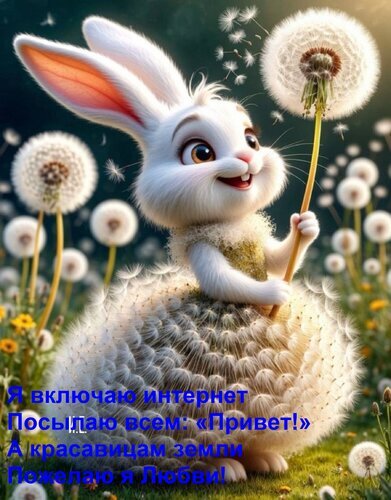 Милая и очаровательная цифровая иллюстрация с изображением белого мультяшного кролика. Кролик одет в пышное платье из пушистых одуванчиков и держит в лапках большой цветок одуванчика. Фон наполнен мягким светом и летящими пушинками, создавая сказочную и нежную атмосферу. На изображении присутствует текст на русском языке с добрым пожеланием любви. Картинка идеально подходит для открыток, поздравительных сообщений и вдохновляющего контента в социальных сетях.