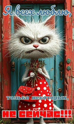 Забавное и ироничное цифровое изображение антропоморфного белого пушистого кота с сердитым выражением мордочки. Кот одет в красное платье в белый горошек и несет через плечо маленькую красную сумочку. В лапах он держит букет сухих цветов. Фон представляет собой винтажную бирюзовую дверь в красноватой раме. На картинке расположен ироничный текст на русском языке: «Я всех люблю, только некоторых, не сейчас!!!», что делает изображение идеальным для юмористических открыток, мемов и соцсетей.