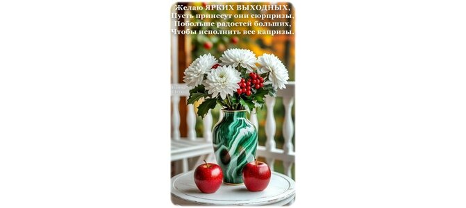 Желаю ярких выходных, пусть принесут они сюрпризы, побольше радостей больших, чтобы исполнить все капризы.