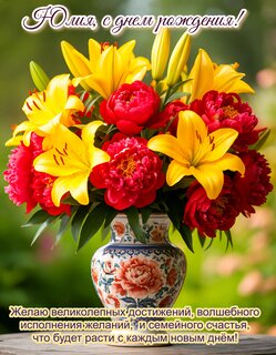 Красивая поздравительная открытка с пышным букетом желтых лилий и ярко-красных пионов в изысканной фарфоровой вазе. На картинке расположена надпись на русском языке: «Юлия, с днем рождения!» сверху и теплое пожелание достижений, исполнения желаний и семейного счастья снизу. Идеальное изображение для отправки имениннице Юлии в мессенджерах или социальных сетях.