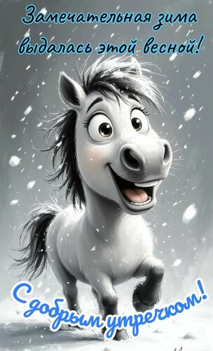 Милая и позитивная открытка с изображением мультяшного белого жеребенка, радостно бегущего сквозь падающий снег. На картинке расположен праздничный текст на русском языке: «Замечательная зима выдалась этой весной!» в верхней части и «С добрым утречком!» в нижней. Иллюстрация выполнена в ярком анимационном стиле, передающем атмосферу зимнего уюта, бодрости и хорошего настроения. Идеально подходит для поздравлений в мессенджерах и социальных сетях.