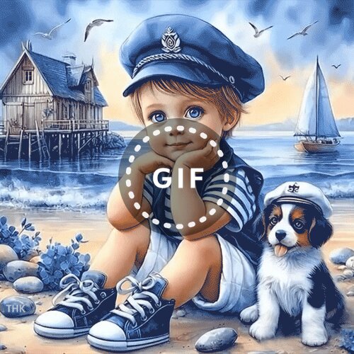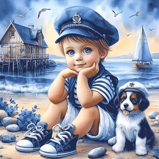 Милая цифровая иллюстрация в нежных пастельных тонах, изображающая маленького мальчика в капитанской фуражке и полосатой тельняшке. Ребенок сидит на песчаном пляже у кромки моря, подперев подбородок руками, с очаровательным и задумчивым взглядом. Рядом с ним сидит маленький пушистый щенок. На заднем плане видны спокойное море, парусная лодка, чайки в небе и уютный деревянный домик на сваях. Изображение наполнено атмосферой детского лета, безмятежности и морских приключений. Идеально подходит для детских комнат, оформления открыток или использования в качестве вдохновляющего фона.