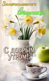 Красивая поздравительная открытка для доброго утра во вторник. На изображении изображен нежный букет белых нарциссов в вазе, чашка горячего ароматного кофе на блюдце и зеленое яблоко на светлом фоне. Надписи на русском языке: "Замечательного вторника!" и "С добрым утром!" создают уютную и позитивную атмосферу. Идеально подходит для отправки друзьям и близким в мессенджерах и социальных сетях для поднятия настроения.