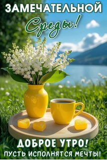 Красивая и вдохновляющая открытка для пожелания доброго утра. На изображении запечатлен солнечный летний день на природе: букет нежных ландышей в желтой вазе, чашка ароматного кофе и маленькие десерты в форме сердечек на деревянной подставке. Фон с озером, горами и голубым небом создает атмосферу спокойствия и уюта. Текст на русском языке гласит: «Замечательной среды! Доброе утро! Пусть исполнятся мечты!» Идеально подходит для отправки друзьям и близким в мессенджерах и социальных сетях для поднятия настроения в среду.