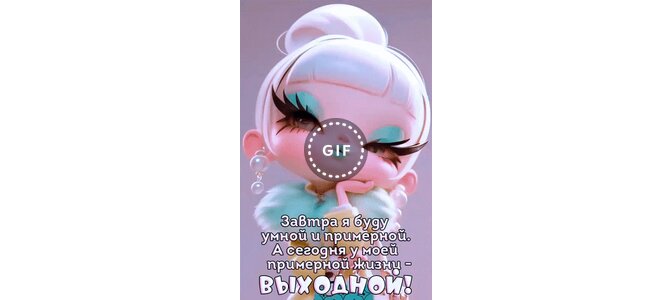 Анимированная открытка "Завтра я буду умной и примерной. А сегодня у моей примерной жизни - выходной!"