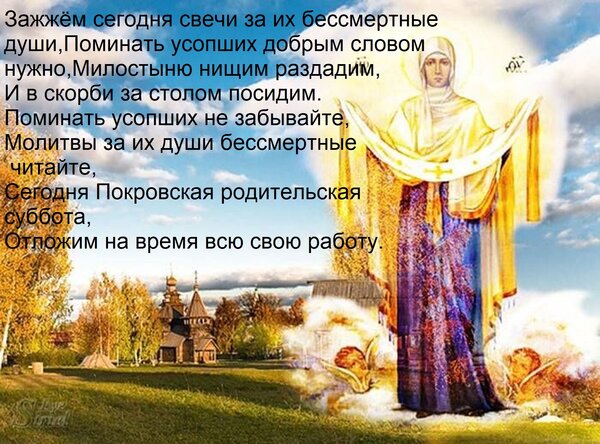 Теги:зажжём сегодня свечи за их бессмертные души, поминать усопших добрым словом нужно, милостыню нищим раздадим, и в скорби за столом посидим поминать усопших не забывайте, молитвы за их души бессмертные читайте, сегодня покровская родительская суббота, отложим на время всю свою работу