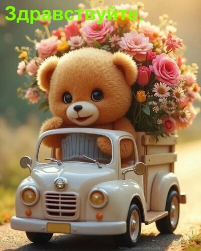 Милая и очаровательная открытка с пушистым плюшевым мишкой, который едет в маленьком белом игрушечном грузовичке, наполненном пышными розовыми цветами. На изображении представлена теплая, праздничная атмосфера, идеально подходящая для отправки в качестве приветственного сообщения или пожелания доброго утра. Нежные пастельные тона, детализированная текстура меха медвежонка и яркие букеты цветов создают ощущение уюта и радости. Подходит для использования в качестве поздравительной картинки для близких, друзей и любимых.