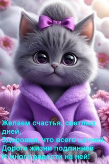 Милое и трогательное изображение серого котенка с большими выразительными глазами, украшенного фиолетовым бантом. Котенок одет в уютную фиолетовую кофту. На картинке размещен поздравительный текст на русском языке: "Желаем счастья, светлых дней, здоровья, что всего ценней, дороги жизни подлинней и много радости на ней!". Идеально подходит для открытки, пожелания добра, душевного поздравления или отправки близким в мессенджерах для поднятия настроения.