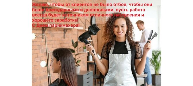 Желаю, чтобы от клиентов не было отбоя, чтобы они был ублагодарными и довольными, пусть работа всегда будет источником отличног роения и хорошего заработка! С Днем парикмахера!