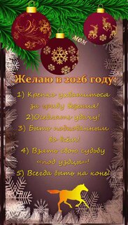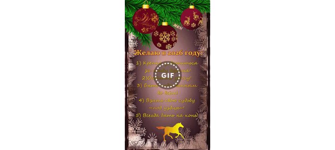 Желаю в 2026 году: 1) Крепко ухватиться за гриву везения! 2) Оседлать удачу! 3) Быть подкованным во всём! 4) Взять свою судьбу «под уздцы»! 5) Всегда быть на коне!
