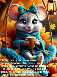 Теги:животных нужно защищать, от злых людей оберегать, они ведь нам с тобой друзья, иначе попросту нельзя нельзя собачек обижать, и кошек по двору гонять, из меха шубу, например, пускай заменит нам мохер
