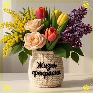 Красивый весенний букет в уютном вязаном кашпо. Композиция включает нежные розовые розы, яркие тюльпаны красного и желтого цвета, ароматную сирень и пышную желтую мимозу. На светлом вязаном горшочке стильная надпись на русском языке «Жизнь прекрасна». Фотография передает атмосферу тепла, радости и весеннего обновления, идеально подходя для вдохновения и декора интерьера.