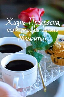 Эстетичное изображение, передающее атмосферу уютного утра или спокойного момента отдыха. На прозрачном стеклянном подносе стоят две чашки черного кофе, рядом лежит аппетитный маффин с ягодами. Композицию украшает нежная красная роза с зеленым листком. Поверх изображения наложена вдохновляющая цитата на русском языке: "Жизнь прекрасна, если умеешь ценить моменты!". Фотография наполнена теплом, уютом и настроением осознанности.