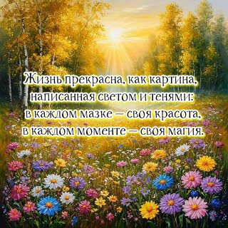 Живописное изображение осеннего пейзажа с залитым солнцем лугом, усыпанным разноцветными полевыми цветами. На фоне — золотистые деревья и мягкие лучи заходящего или восходящего солнца, создающие атмосферу тепла и умиротворения. Поверх картины наложен вдохновляющий текст на русском языке: "Жизнь прекрасна, как картина, написанная светом и тенями: в каждом мазке — своя красота, в каждом моменте — своя магия". Изображение идеально подходит для использования в качестве обоев, цитат для соцсетей, открыток или вдохновляющего контента о красоте жизни и природы.