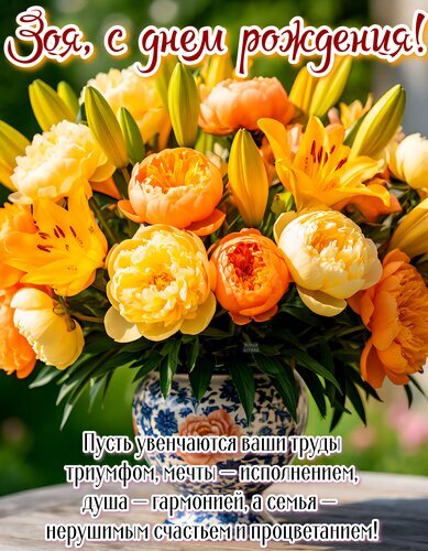 Красивая поздравительная открытка к дню рождения для женщины по имени Зоя. На изображении представлен пышный и яркий букет из оранжевых и желтых цветов (пионы и лилии) в изящной сине-белой вазе. Сверху расположена надпись белым шрифтом: «Зоя, с днем рождения!», а снизу — душевное пожелание: «Пусть увенчаются ваши труды триумфом, мечты — исполнением, душа — гармонией, а семья — нерушимым счастьем и процветанием!». Идеально подходит для отправки в мессенджерах и социальных сетях.